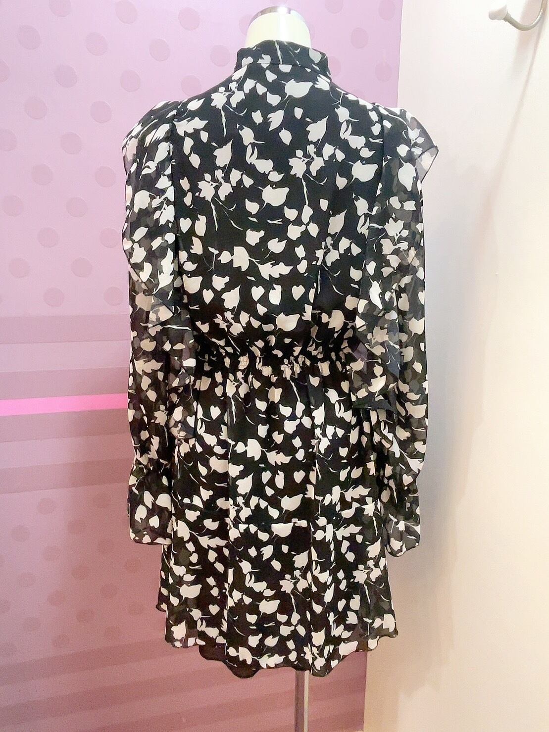 涼やかな風を感じるリーフ柄が目を引くシフォンフリルワンピース、RINASCIMENTO。繊細なシフォン素材とフリルのデザインが女性らしい印象を与えます。モノトーン配色なので、どんなシーンでも着こなしやすく、さまざまな場面で活躍してくれます。